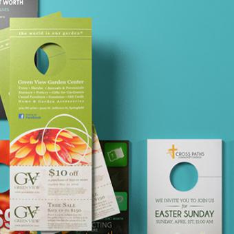 A door hanger (also spelled as doorhanger or door-hanger) is cardboard sign cut to hang from the handle or knob of a door. Promotional hanger is a quite effective and inexpensive solution to enhance your brand, promote your products and services or announce an event or sales campaign. They allow you to take advantage of the attention paid to the object they are hung on. In other words, door hanger is the most cost-effective and efficient way to provide your potential clients with promotional information, literally “door-to-door”.