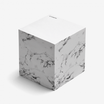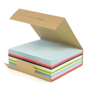 Notepads are glued sheets of paper. 80 gsm uncoated paper or matte coated paper from 80 to 150 gsm is commonly used for notepads. The usual size is 90 x 90 mm, number of sheets varies from 100 (9x9x1 cm) to 900 (9x9x9 cm). Side gluing allows making a block of sheets.